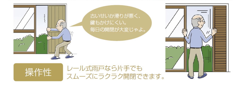 レール式雨戸、雨戸一筋なら片手でもスムーズに